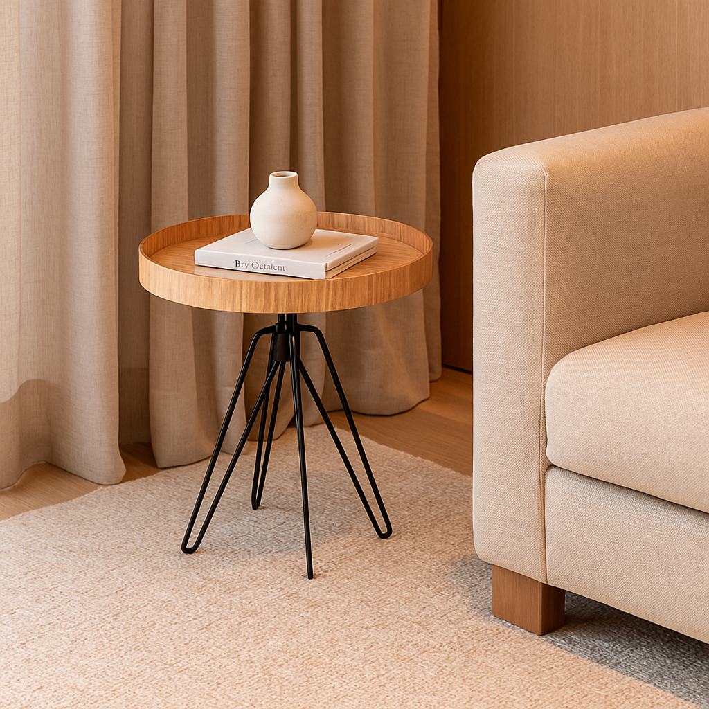A mesa lateral Alice combina a leveza das formas contemporâneas com a elegância natural da madeira. Seu tampo tipo bandeja, em lâmina natural, traz textura e funcionalidade, enquanto a base metálica delicada adiciona um toque moderno e sofisticado.