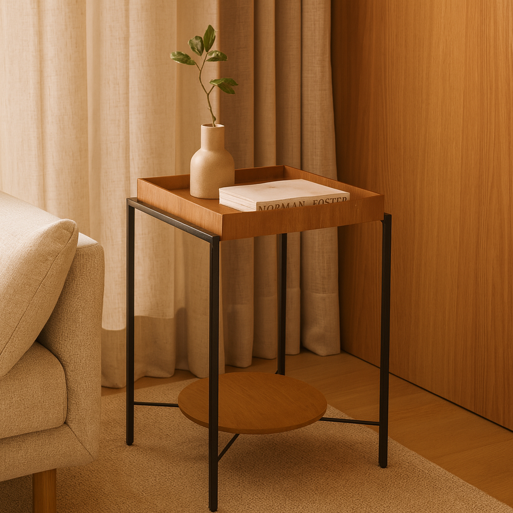 Com estrutura metálica e tampos em lâmina natural, ela traz um toque contemporâneo e acolhedor — ideal para compor salas e ambientes de estar com sofisticação.