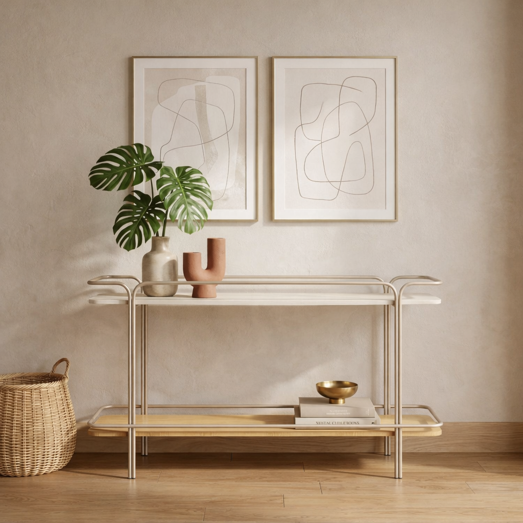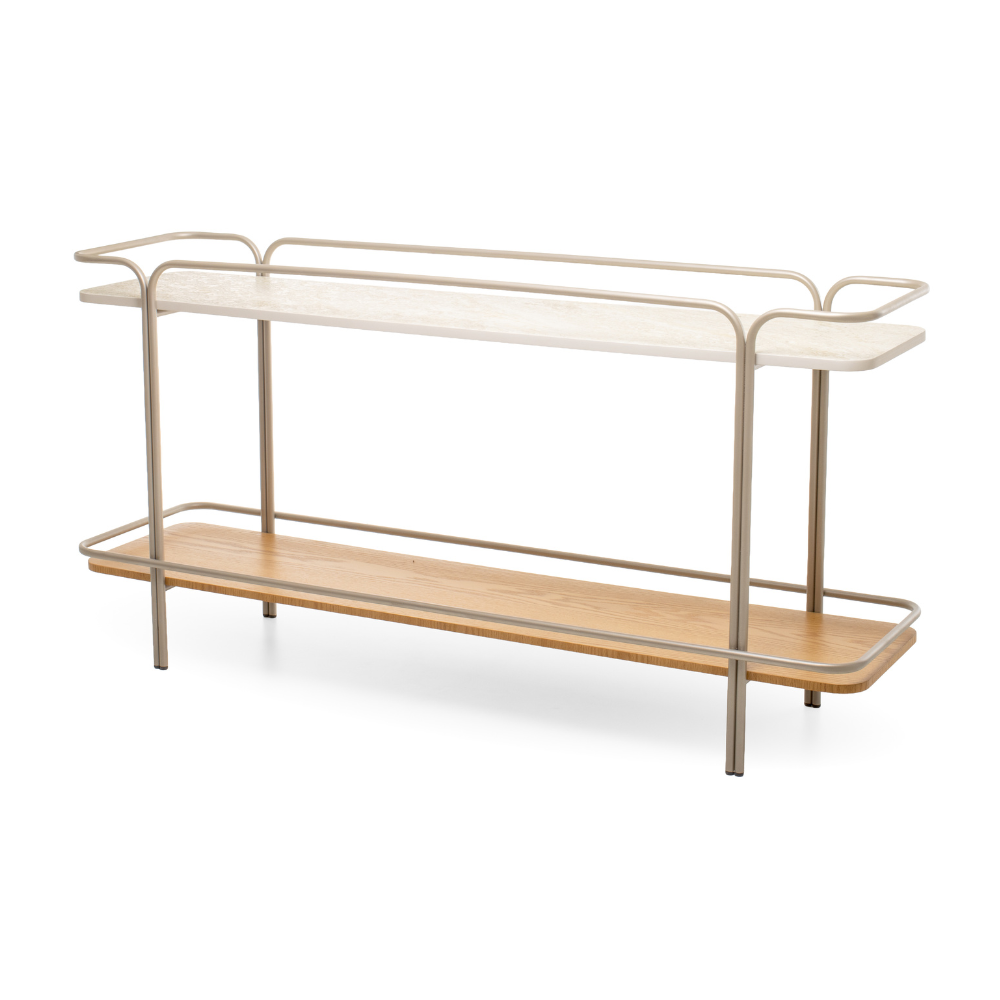 O Aparador Aurun se destaca pelo design elegante e pela estrutura tubular metálica com curvas orgânicas, que criam uma sensação de movimento e leveza no ambiente. Com dois níveis de prateleiras em tons suaves, é uma peça versátil que valoriza a decoração sem sobrecarregar o espaço, ideal para halls de entrada, salas de estar e ambientes que pedem funcionalidade com estética refinada.