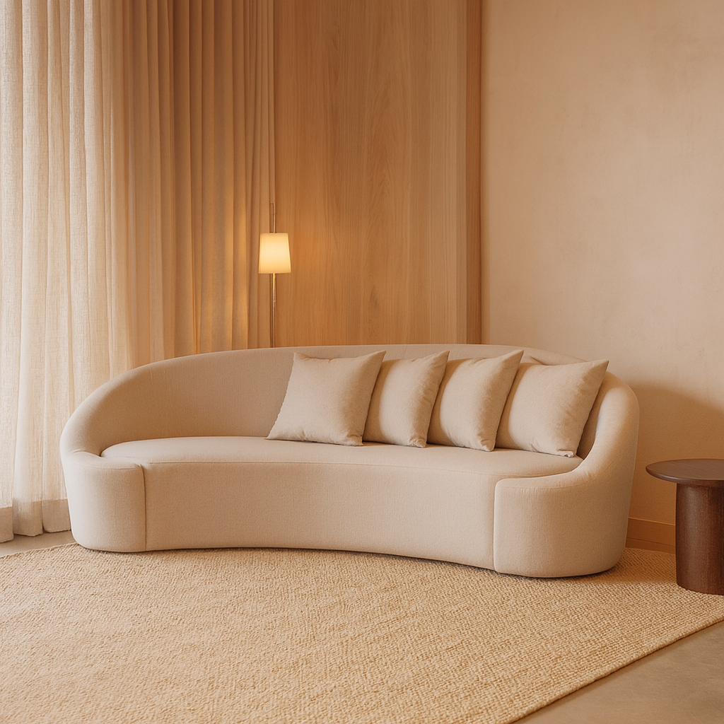 O Sofá Bueto encanta pelo design curvo e pela sensação de acolhimento que transmite. Seu visual escultural transforma o ambiente em um espaço sofisticado e contemporâneo, sem abrir mão do conforto e da maciez.