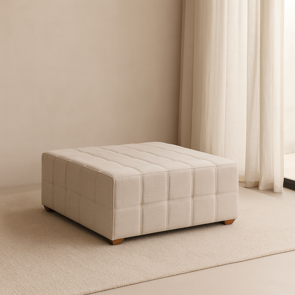 O Puff Calabria é uma peça de design limpo e atemporal, perfeita para composições modulares e espaços de convivência. Seu estofado amplo e o acabamento em gomos criam uma sensação de aconchego sofisticado, enquanto os pés em madeira trazem um toque natural e acolhedor.