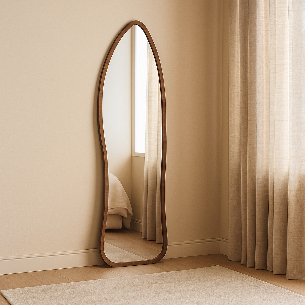 O espelho Elle combina curvas suaves e uma moldura ondulada em madeira, criando uma peça escultural que se destaca pela leveza e pelo design contemporâneo. Seu formato alongado proporciona amplitude visual e adiciona um toque sofisticado a salas, quartos, halls ou closets, tornando o espaço mais acolhedor e estiloso.