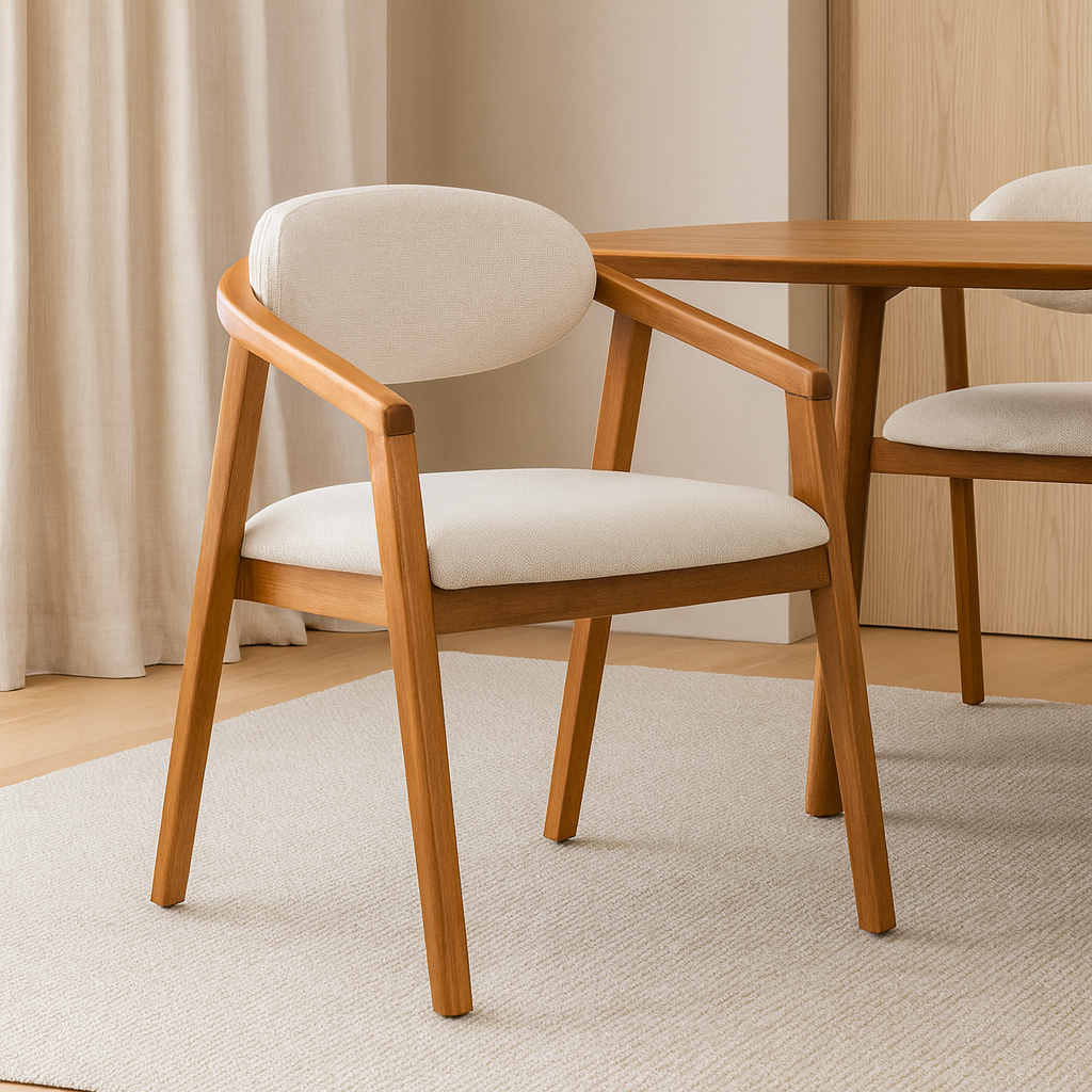 A cadeira Katrina combina linhas levemente anguladas com curvas suaves, criando um design equilibrado e contemporâneo. O assento e o encosto estofados oferecem conforto imediato, enquanto a estrutura em madeira de eucalipto reforça a resistência e traz uma estética natural que harmoniza com diversos estilos de mesa de jantar.