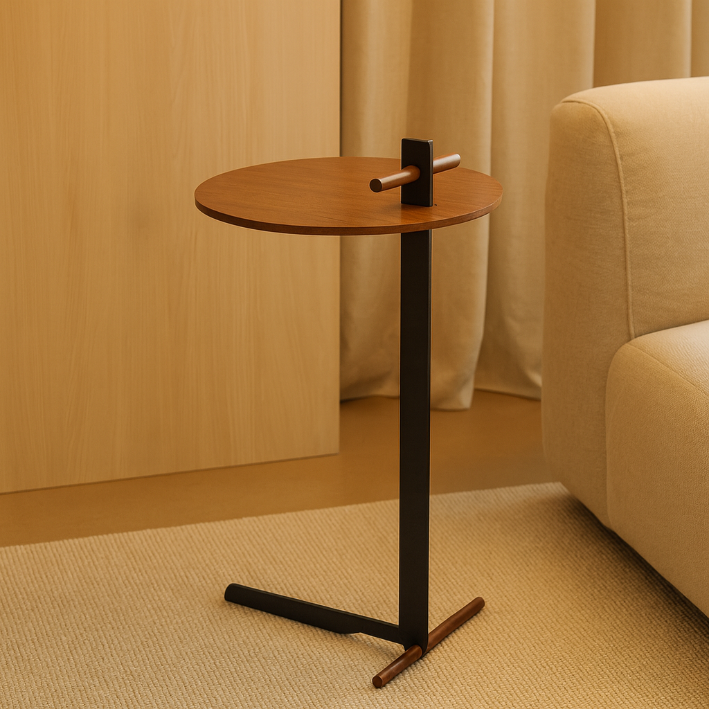 A mesa lateral Luna combina formas leves e um toque de originalidade. Seu tampo redondo em lâmina natural repousa sobre uma estrutura metálica de linhas verticais marcantes, destacada por detalhes em madeira na base e na haste — uma composição que une modernidade e aconchego em perfeita harmonia.