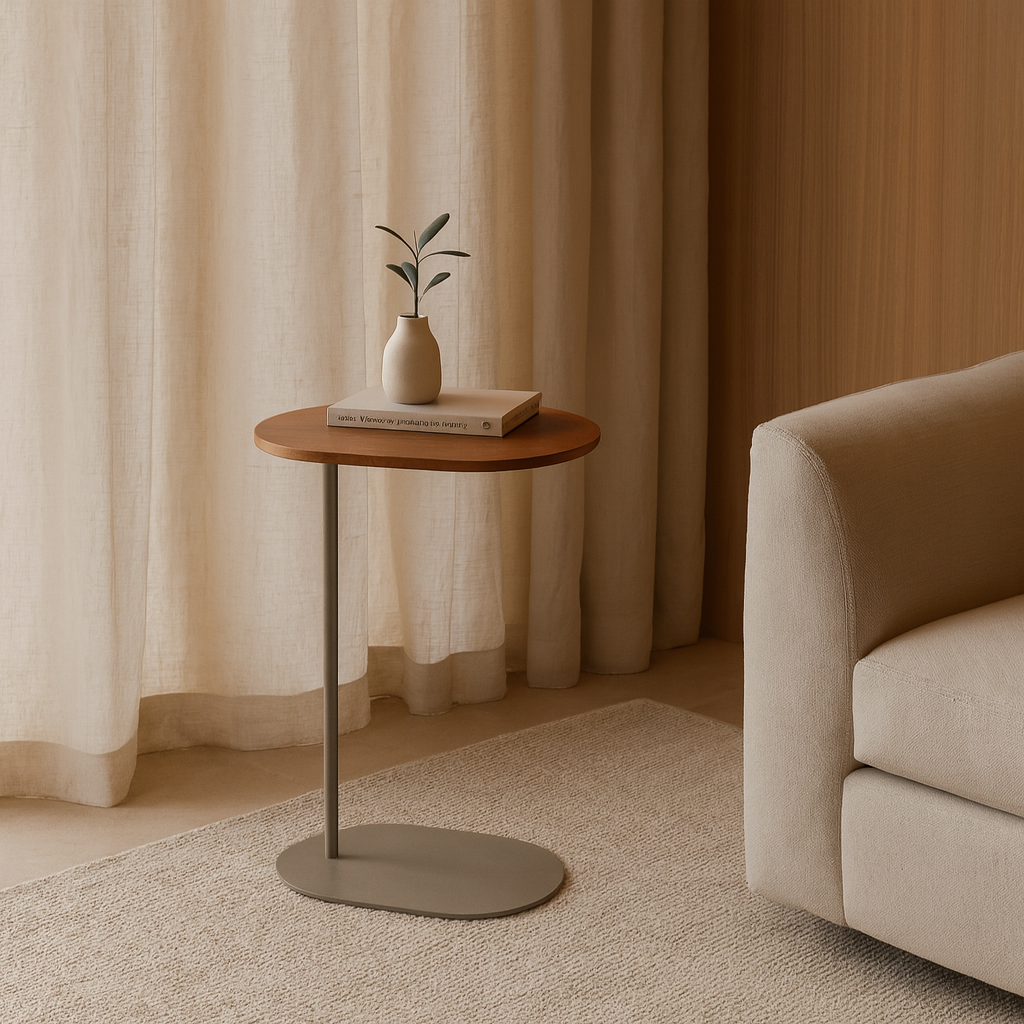A mesa lateral Luzia combina leveza visual e funcionalidade em um design contemporâneo. Seu tampo em lâmina natural traz textura e aconchego, enquanto a base metálica de traços sutis garante estabilidade e um toque moderno.