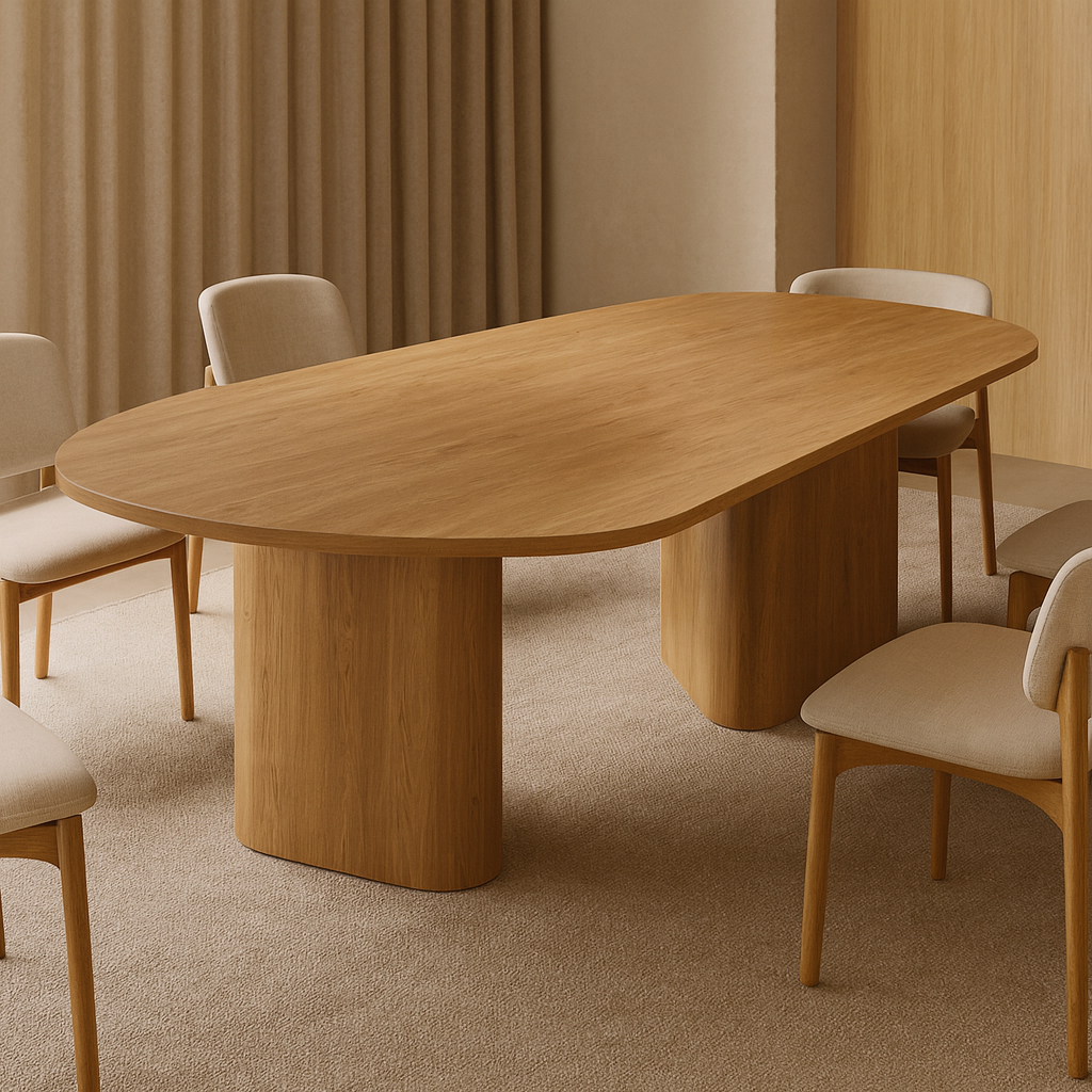A mesa de jantar Maly apresenta curvas suaves e um tampo amplo, combinado a bases robustas de linhas arredondadas que conferem equilíbrio visual e presença marcante ao ambiente. Seu formato orgânico favorece a circulação e cria uma atmosfera leve e contemporânea para salas de jantar de diferentes estilos.