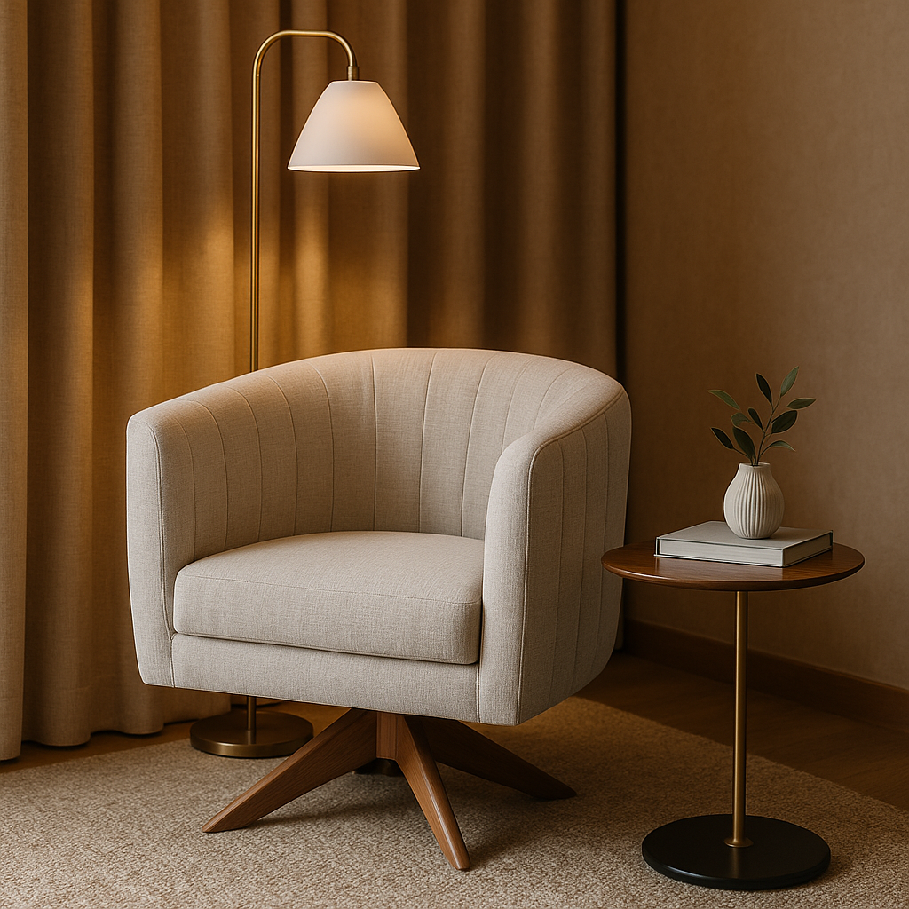 A Poltrona Margot traz um design curvo e envolvente que transmite aconchego imediato. Sua base giratória em madeira une funcionalidade e sofisticação, tornando a peça perfeita para composições modernas que valorizam conforto e praticidade.