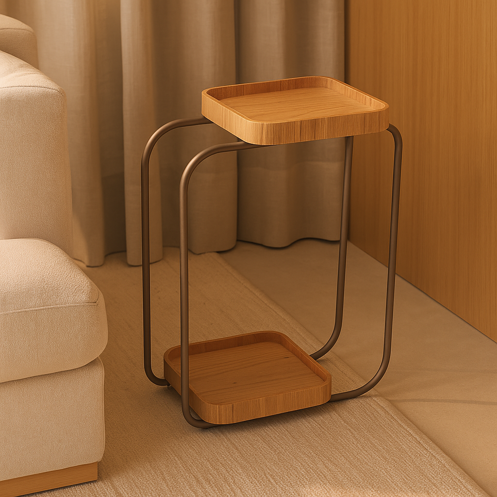 Seu design com bandejas em lâmina natural adiciona praticidade e charme ao ambiente, enquanto a estrutura metálica confere estabilidade e um toque contemporâneo.