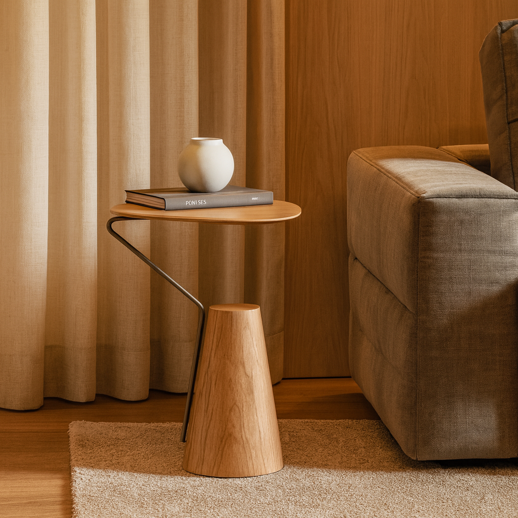 A mesa lateral Montecarlo combina curvas elegantes e estrutura marcante em um design que une arte e funcionalidade. Sua base cônica em madeira confere estabilidade e sofisticação, enquanto o tampo suspenso em lâmina natural parece flutuar, criando um visual leve e contemporâneo. Ideal para quem busca uma peça de destaque com personalidade.